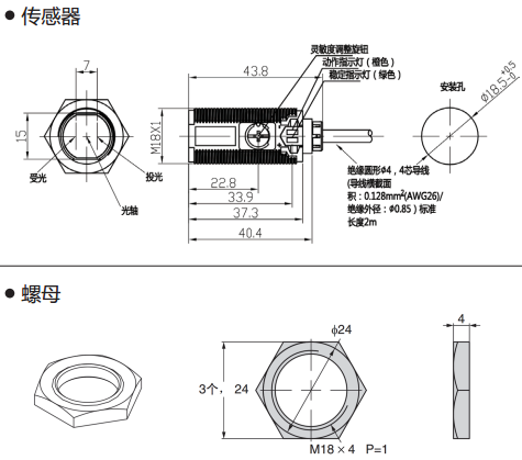 M18带螺纹镜头,双指示灯自诊断功能,专用IC设计,放大器内置型。默认NPN。