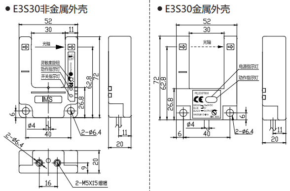 牢固金属外壳,30mm槽距,最高响应可达20us,最高检测精度可达0.1mm,动作指示,稳定指示,可用于工具断裂检测,齿轮测速,标签检测等运用,Light on / Dark on 灵活切换满足不同动作需求。默认NPN。