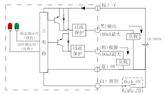 牢固加厚非金属壳体,50mm大槽距,响应时间1ms 、 0.25ms可选,动作指示,稳定指示,可用于工具断裂检测,齿轮测速,标签检测等运用,亮动或暗动灵活切换满足不同动作需求。默认NPN。