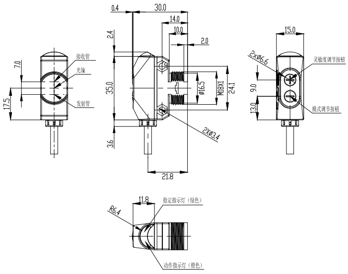 M18带螺纹镜头,双指示灯自诊断功能,专用IC设计,放大器内置型。默认NPN。