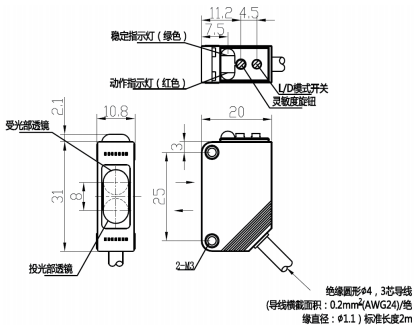 M18带螺纹镜头,双指示灯自诊断功能,专用IC设计,放大器内置型。默认NPN。