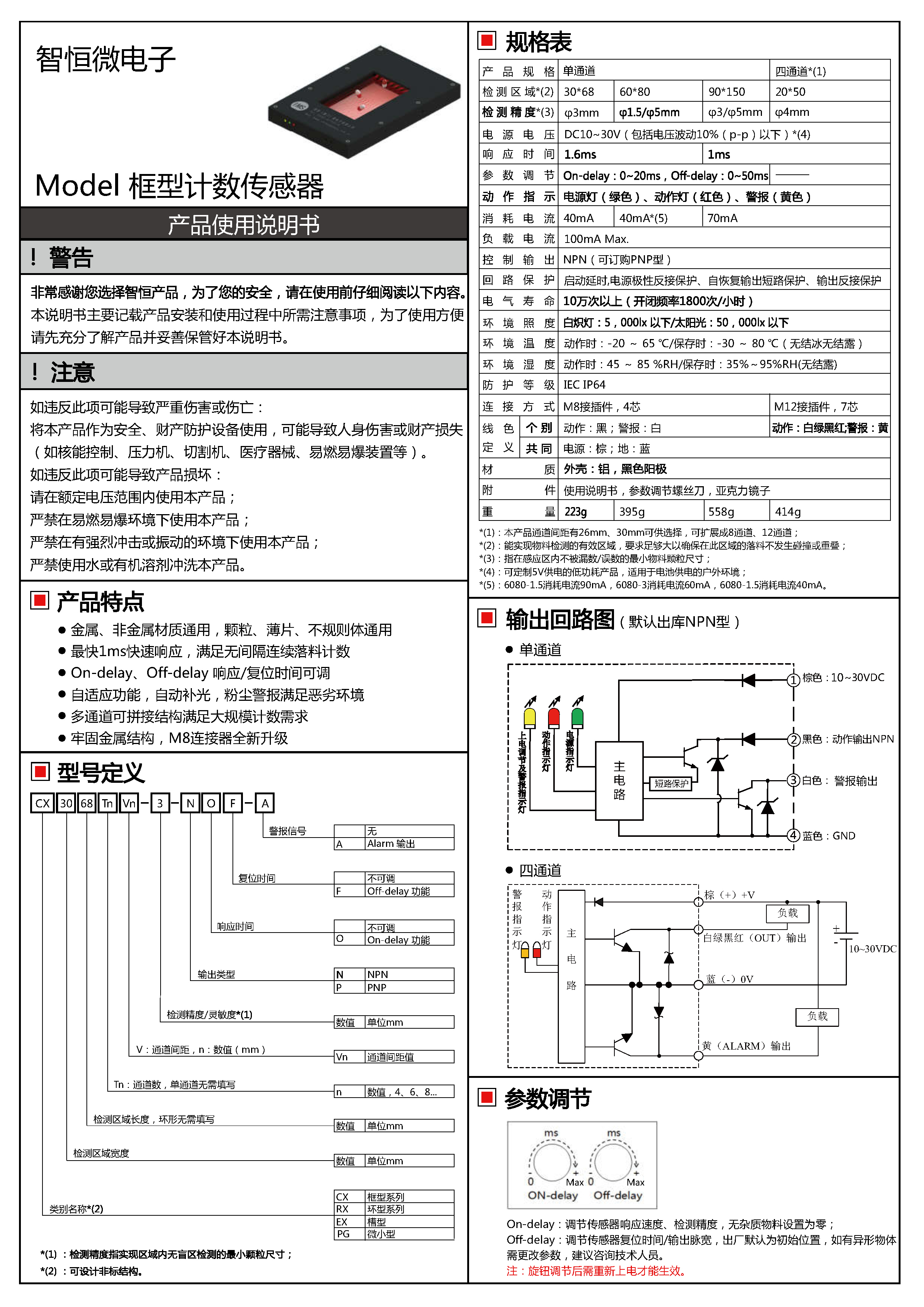 CX系列计数传感器可用于规则/不规则小物体的计数,on/off delay 时间可调,多种窗口尺寸可选。